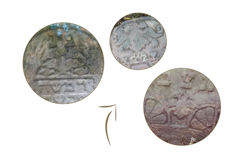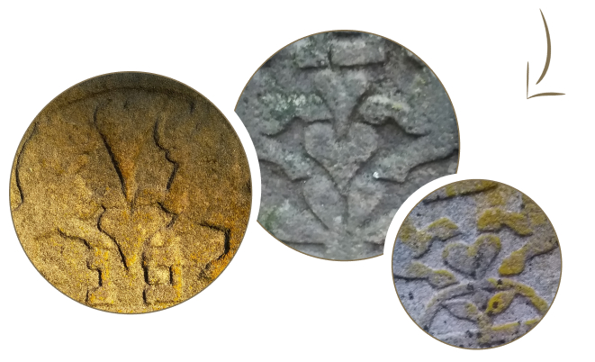Проработка этой детали орнамента глубокая, почти скульптурная. Вероятно, такая форма является реминисценцией двух витых колонн из Храма Соломона — Иахин и Боаз, ставших распространенным символом. Одновременно с этим, колонны данных надгробий, подчеркнутые цветочными базами и капителями, могут иметь характер древа. Такую же семантику могут иметь колонны в орнаменте оборотной стороны еще одного надгробия. Здесь архитектурные детали «врат» сочетаются с растительными — из колонн произрастают ветви с обилием плодов.